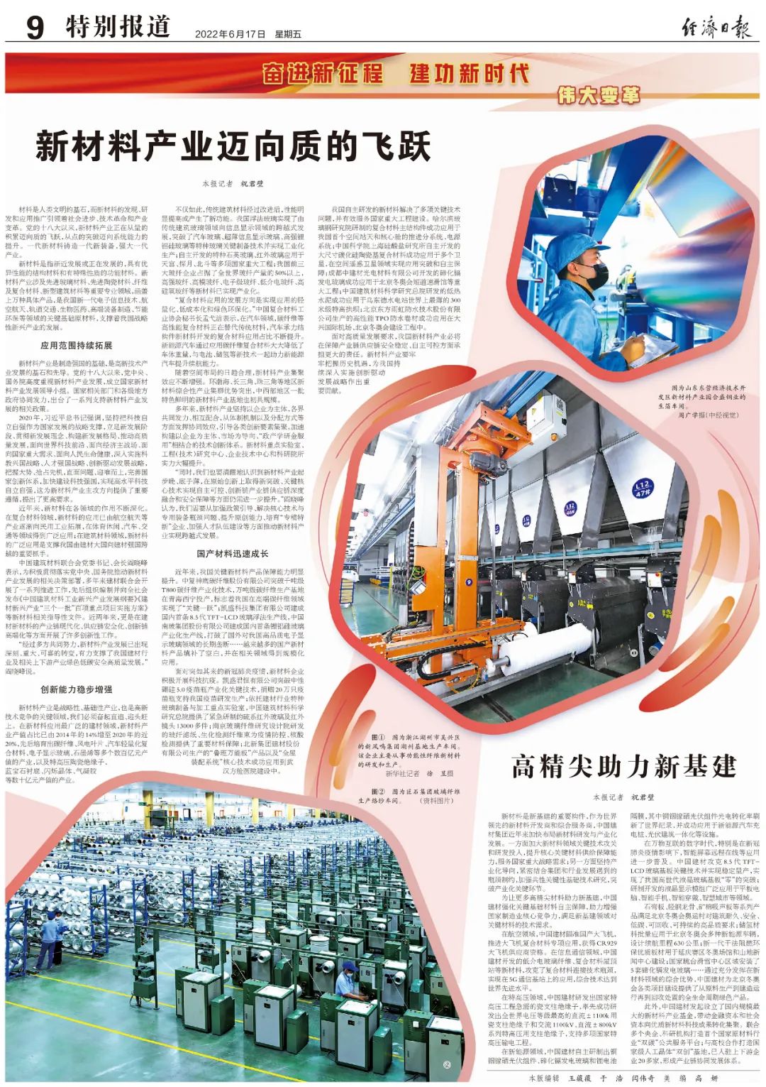 6月17日,为喜迎党的二十大,《经济日报》的“奋进新征程 建功新时代”的伟大变革特别报道刊发了《新材料产业迈向质的飞跃》以及《高精尖助力新基建》的组稿。《新材料产业迈向质的飞跃》文章介绍,党的十八大以来,新材料产业正在从量的积累迈向质的飞跃,从点的突破迈向系统能力的提升,应用范围持续拓展,创新能力稳步增强,以中国建材为代表的国产材料迅速成长。《高精尖助力新基建》短文专门报道了中国建材所属企业在新材料助力新基建领域取得的诸多成绩。