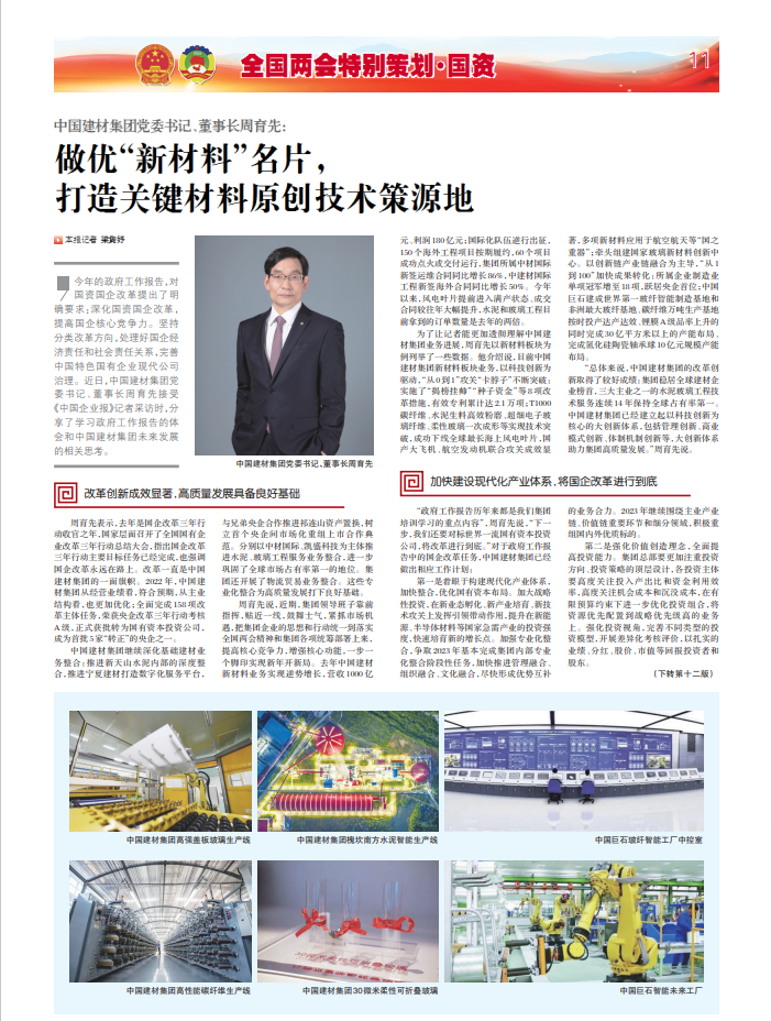 来源:中国企业报 发布时间:2023-03-152023年全国两会政府工作报告对国资国企改革提出了明确要求:深化国资国企改革,提高国企核心竞争力。坚持分类改革方向,处理好国企经济责任和社会责任关系,完善中国特色国有企业现代公司治理。《中国企业报》“全国两会特别策划”栏目刊发了中国建材集团党委书记、董事长周育先的专访文章。小料将全文分享给大家。