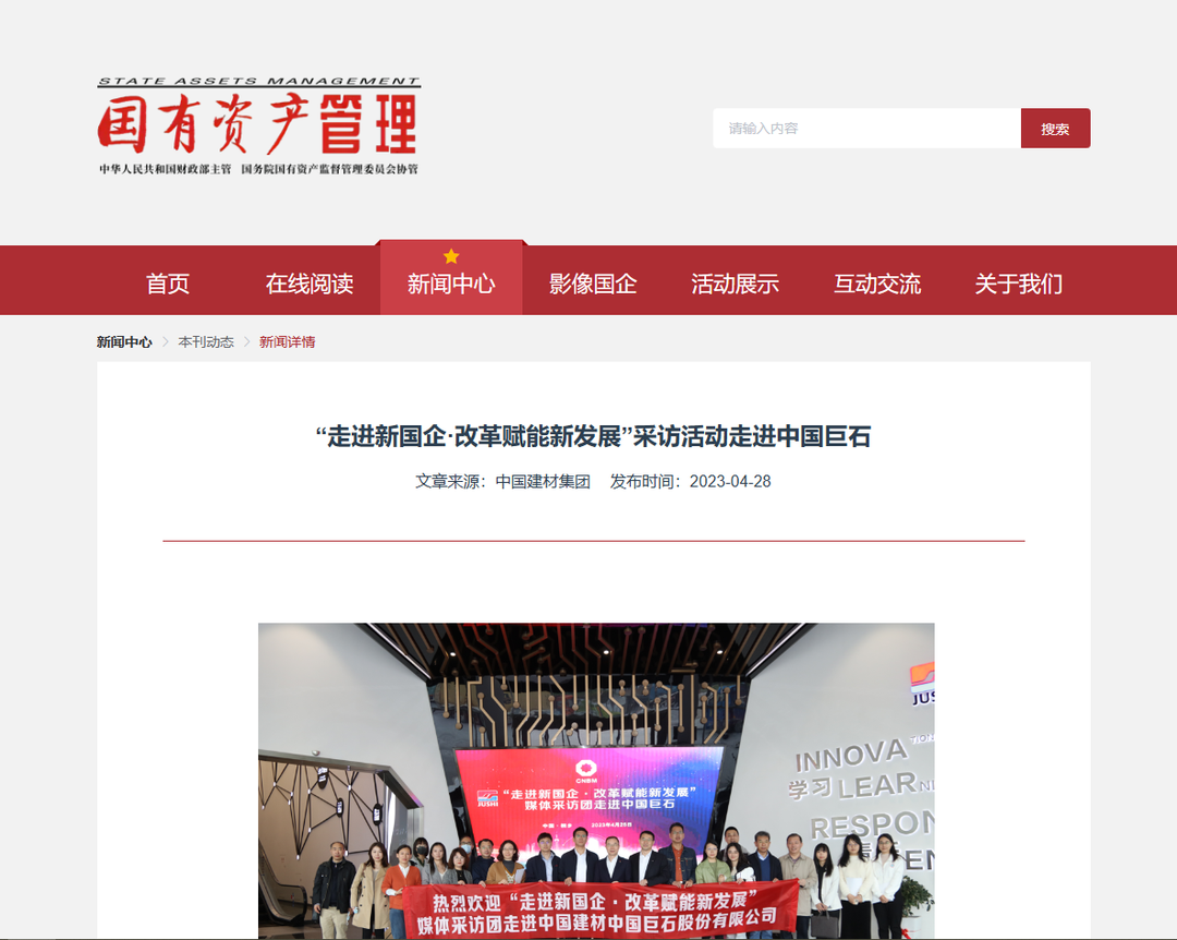 来源:国资委官方网站、经济日报、科技日报、中国青年报、工人日报、中国证券报、第一财经、国有资产管理杂志、环球网 发布时间:2023-06-05近日,国资委宣传局、新闻中心联合组织“走进新国企·改革赋能新发展”大型融媒采访活动走进中国建材,国资委改革办、国资委研究中心专家和十多家中央权威主流媒体记者实地探访了中国巨石,参观了玻纤智能制造基地、智慧展示中心以及巨石成立三十周年成果展,纷纷报道点赞我们先进的玻纤生产技术、智能的制造流程、丰富的产品种类、广泛的应用领域。