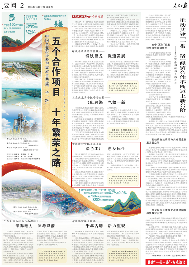 来源:人民日报 发布时间:2023-10-1610月12日,《人民日报》要闻版刊发《中国企业积极参与高质量共建“一带一路”——五个合作项目 十年繁荣之路》,报道了中国建材赞比亚工业园绿色工厂惠及民生的故事。
