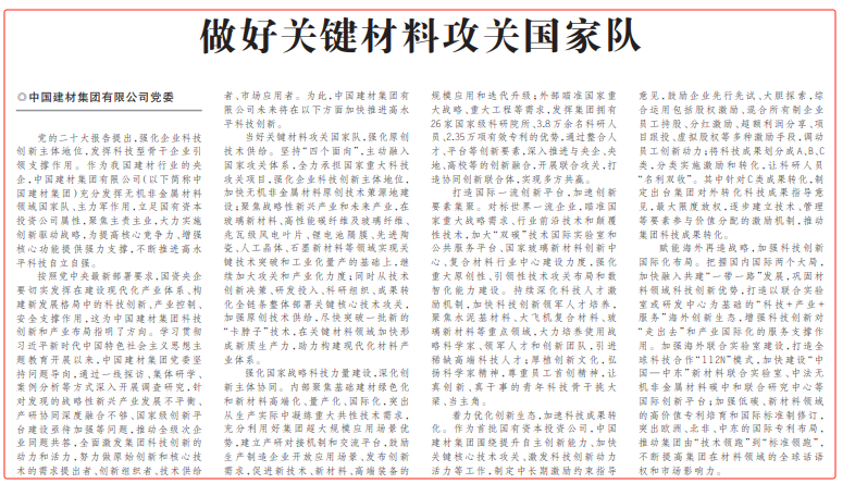 党的二十大报告提出,强化企业科技创新主体地位,发挥科技型骨干企业引领支撑作用。作为我国建材行业的央企,beat365体育官方网站充分发挥无机非金属材料领域国家队、主力军作用,立足国有资本投资公司属性,聚焦主责主业,大力实施创新驱动发展战略,为提高核心竞争力、增强核心功能提供强力支撑,不断推进高水平科技自立自强。