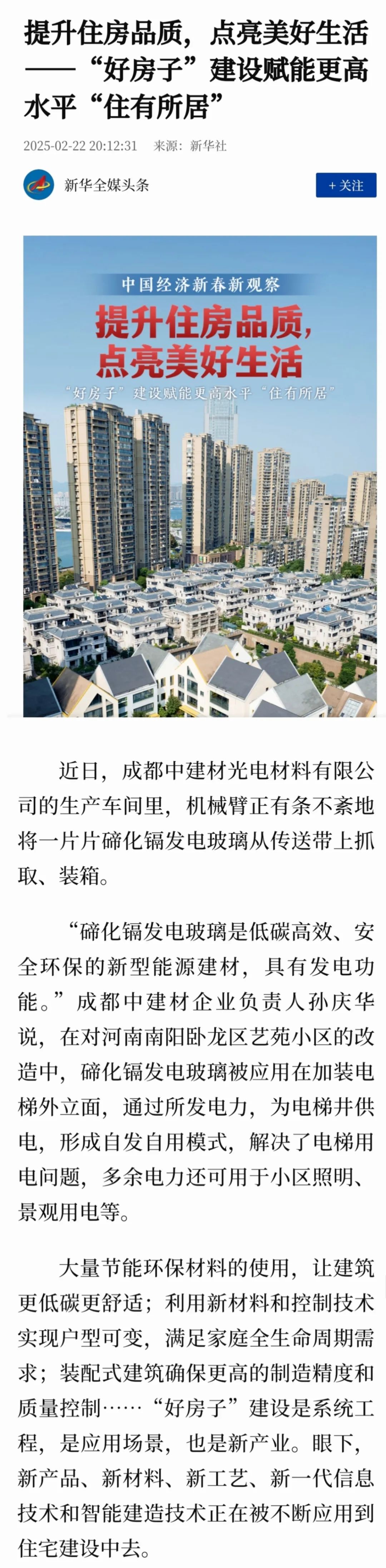 近日,新华社发文《提升住房品质,点亮美好生活——“好房子”建设赋能更高水平“住有所居”》。文章报道,成都中建材的碲化镉发电玻璃被应用在加装电梯外立面,通过所发电力,为电梯井供电,形成自发自用模式,解决了电梯用电问题,多余电力还可用于小区照明、景观用电等。