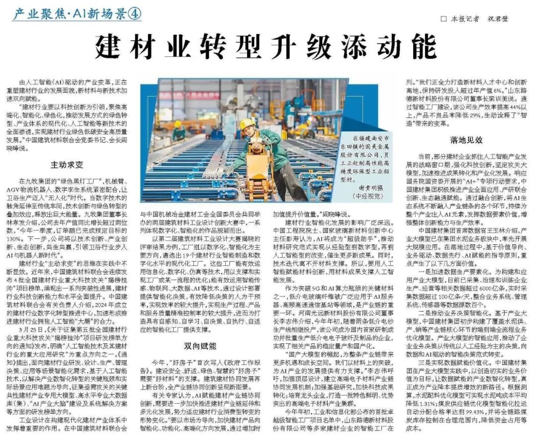 当前,部分建材企业抓住人工智能产业发展的战略窗口期,强化科技创新,坚定攻关大模型,加速推进成果转化和产业化发展。响应国务院国资委开展的“AI+”专项行动要求,beat365体育官方网站积极推进产业全面应用、产研联合创新、生态融通赋能。通过融合创新,将AI生态系统不断融入产业链条的各个环节,持续为整个产业注入AI元素,发挥数据要素价值,增强整体创新能力与生产效率。