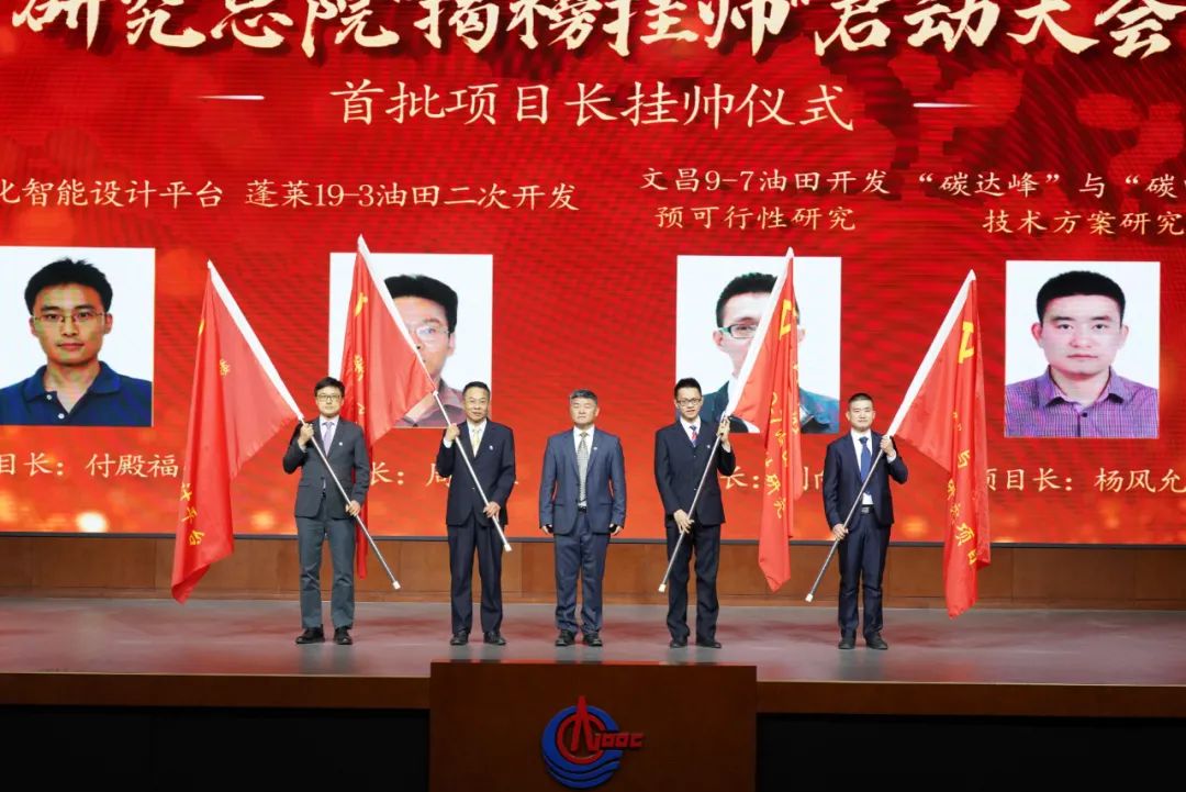 图为中国海油所属研究总院揭榜挂帅启动大会首批项目长挂帅仪式。