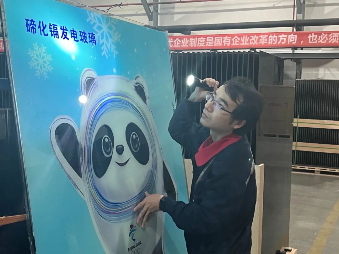 方案选定之后,正值元旦假期,李浩与公司同事坚守工作一线,进行产品打样、评估。“这个图案需要双面呈现”“正负极焊接点要平整,焊接后整体厚度必须控制在0.3mm以内”“安装框的粘接结构胶需要使用透明色的,这样呈现的效果会好很多”,一条条优化建议在讨论中进行碰撞、论证,一步步地完善选定的设计方案,大家都知道,这个时候需要不断地碰撞,才能发现可能隐藏的细小问题,才能让碲化镉发电玻璃在冬奥赛场上得到完美的体现。