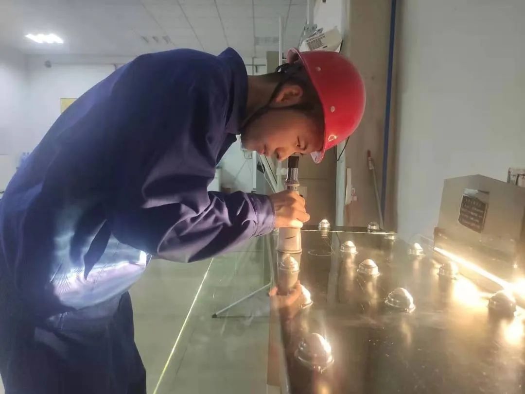 面对市场洪流、担负企业使命,优质超白浮法玻璃研发迫在眉睫,2021年濮阳光材组织企业生产骨干,成立“优质超白浮法产品攻关小组”,吹响了超白玻璃生产攻坚战的号角。张亚男作为生产制造部的新生代骨干力量,积极参与到产品攻关过程中。当时熔化工艺制度基本建立在普通浮法基础上进行优化改良,面对着每小时数以千计的气泡总量,攻关组承受着巨大的生产经营压力,在小组组长、骨干的带领下,张亚男白天奔波于熔窑、质检现场,每采取一项调整措施,就在质检室认真细致地分析气泡形态、大小、分布及气体成分,然后采用PDCA循环工作方法,快速有效地制定攻关措施。有次在窑炉巡检过程中,他发现冷却部稀释风管入口与胸墙处有3-5mm的间隙,于是立刻小跑到攻关指挥部,向组长反映了此问题,在大家的集思广益下,听取了张亚男的建议,对此间隙采用耐高温玻璃纤维布进行缠绕密封,超白玻璃上表面气泡问题得到有效改观。正是因为公司有一批像张亚男一样的技术骨干在不辞辛苦、夜以继日、敢于创新、勇于突破的不懈努力下,2021年9月濮阳光材超白产品质量达到双“90”的攻关目标,公司产品结构得到大幅度提升,市场核心竞争力有效提高。