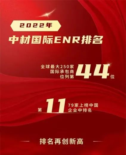 近日,2022年度美国《工程新闻纪录(ENR)》“全球最大250家国际承包商”榜单发布,中材国际再次上榜,位列全球44位,同比上升16位,位列上榜中国企业11位,同比上升2位。