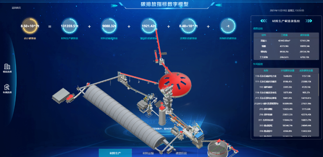 不断完善水泥工程建设全生命周期数字化解决方案,率先在行业内实现二维设计向三维数字设计的变革。自主开发的工厂碳排放数字化核算平台,实现了对工厂全生命周期碳排放的精细化计算和实时动态监控,引领行业绿色设计、绿色建造