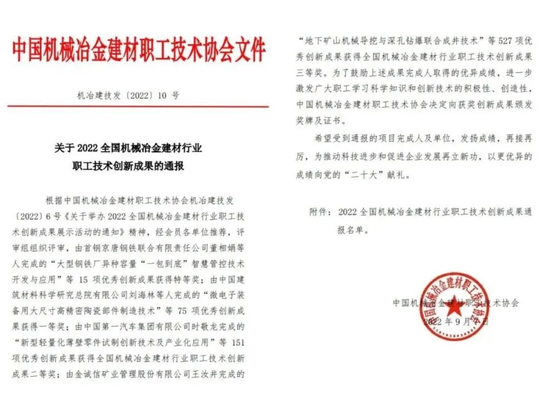 中国建材总院99个项目荣获全国机械冶金建材行业职工技术创新成果奖