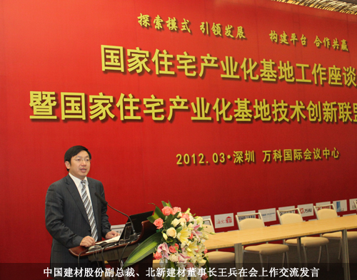 3月30日,由住房和城乡建设部住宅产业化促进中心发起的“国家住宅产业化基地工作座谈会暨国家住宅产业化基地技术创新联盟联席会”在深圳万科总部召开。有来自住建部、广东省建设厅、各地住建委及产业化促进中心、各产业化基地代表等约120人参会。住建部副部长齐骥出席会议并讲话,中国建材股份副总裁、北新建材董事长王兵应邀出席,并就北新建材住宅产业化发展模式在会上作交流发言。