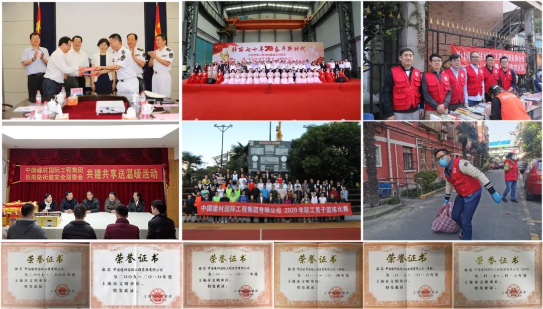 中国建材工程坚持精神文明建设与生产经营双融、共促的工作理念,建立健全精神文明建设责任机制,将文明创建工作融入中心工作、服务企业发展,形成了党委统一领导、党工团齐抓共管的良好局面。持续深入开展“不忘初心、牢记使命”主题教育,以高质量党建推动企业高质量发展;完善科学管理,优化人才培养,充分发挥群团组织的纽带作用,保障职工权益;强化社会责任,积极参与各类扶贫帮困活动,定期开展志愿者服务,与社区、部队长期保持共建;紧贴员工所愿、社会所需,以提升员工文明素质和企业文明程度为目标,大力弘扬和践行社会主义核心价值观,组织开展了一系列主题鲜明、内容丰富的创建活动,为企业改革发展、转型升级、提质增效、干事创业凝聚起正能量。