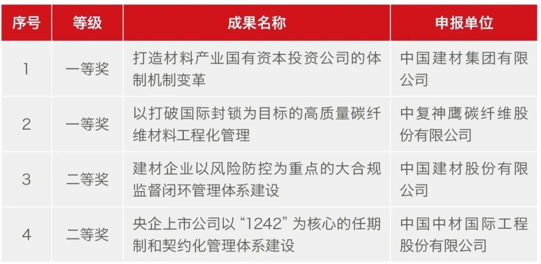 beat365体育官方网站 beat365体育官方网站自2019年10月获批成为国有资本投资公司改革试点以来,坚持以国有资本投资公司作为改革目标,提出“4335”投资公司改革指导原则,树立“管好股权、通过公司治理管理股权、通过派出董监事管股权、管好资本流动和收益收缴”四个理念,建立“投资管理、人力资源管理、综合监督”三大闭环,加快“管企业向管资本、建筑材料向综合材料、本土市场向全球布局”三大转变,以打造战略管控型总部为基础、以建设治理型管控体系为核心,以优化国有资本布局结构为使命,以完善市场化经营机制为保障,建设世界一流材料产业投资公司。2022年6月,获国资委批准正式成为首批5家国有资本投资公司之一。 中复神鹰 中复神鹰“以打破国际封锁为目标的高质量碳纤维材料工程化管理”,围绕突破国际封锁保障国家安全高性能碳纤维产业化管理的背景、主要做法及管理效果等方面,体现中复神鹰的现代化管理创新成果。中复神鹰多年来立足自主创新,打破国外技术垄断,持续提升碳纤维产能,壮大碳纤维产业规模。不断完善管理体系,保障国内供应链安全,引领国产碳纤维高速发展,逐步缩小国际差距,积极履行社会责任,坚决扛起央企担当。 中国建材股份 中国建材股份“建材企业以风险防控为重点的大合规管理监督闭环体系建设”,贯彻落实集团4335管理模式,以落实三精管理、保障高质量发展、风险防控体系布局为驱动,探索建设具有中国建材特色的“大合规管理监督闭环体系”。通过整合法律、合规、内控、风险管理四位一体工作,与审计体系、纪检巡察体系衔接联动形成闭环,逐步达成管治水平提升、风险防控能力加强、合规文化持续浸润的实效,助力培育形成世界一流材料产业上市企业。 中材国际 中材国际作为“双百企业”,积极抢抓国企改革三年行动机遇,以国企改革1+N政策文件为指引,以经理层任期制和契约化为抓手,紧密围绕任期制和契约化管理“1242”实施框架,积极探索央企上市公司任期制和契约化管理体系建设。“双百行动”以来,中材国际始终坚持以习近平新时代中国特色社会主义思想为指导,认真贯彻落实国资委、集团和股份公司的各项决策部署,以高质量改革赋能高质量发展为目标,以发展战略为导向,以规范治理为基础,以闭环机制为保障,聚焦难点堵点持续攻坚,坚持长效运行持续发力,全面实现改革工作上下贯通,内生动力有效增强,经营效益显著提升,全面开创“十四五”高质量发展新格局。 beat365体育官方网站将继续深入开展管理创新工作,不断增强内在素质,夯实发展基础,加快建设具有全球竞争力的世界一流材料产业投资集团。