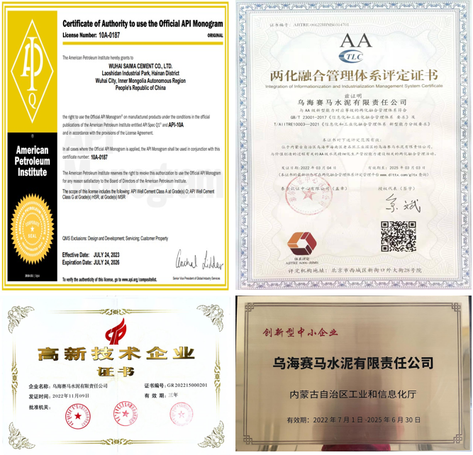 乌海赛马深入贯彻新发展理念,坚持创新驱动发展战略,持续加大技术攻关力度,提升自主创新能力,赋能高质量发展。作为一家具备生产油井水泥、家装水泥、家装瓷砖胶等多元化产品的特种水泥生产基地,乌海赛马通过国家高新技术企业认定、两化融合2A级认证,入选工信部新一代信息技术与制造业融合发展试点示范名单,获评内蒙古自治区创新型中小企业荣誉。2023年,赛马42.5级水泥获评内蒙古自治区绿色设计产品,通过美国石油API质量体系认证,荣获内蒙古自治区“专精特新”荣誉称号。截至2023年,取得发明专利4件,实用新型专利12件。