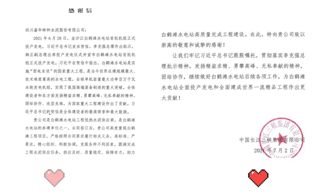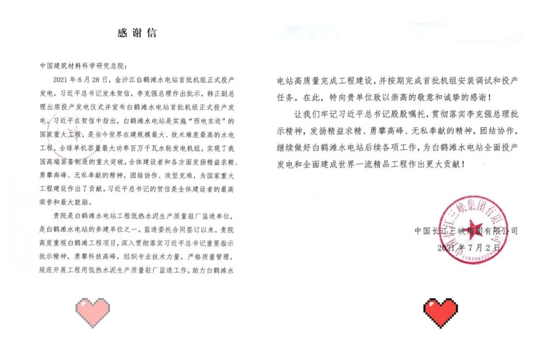 7月5日,beat365体育官方网站所属中国建筑材料科学研究总院有限公司(以下简称“中国建材总院”)和嘉华特种水泥股份有限公司(以下简称“嘉华水泥”),分别收到了来自白鹤滩水电站开发建设方中国长江三峡集团有限公司的感谢信。