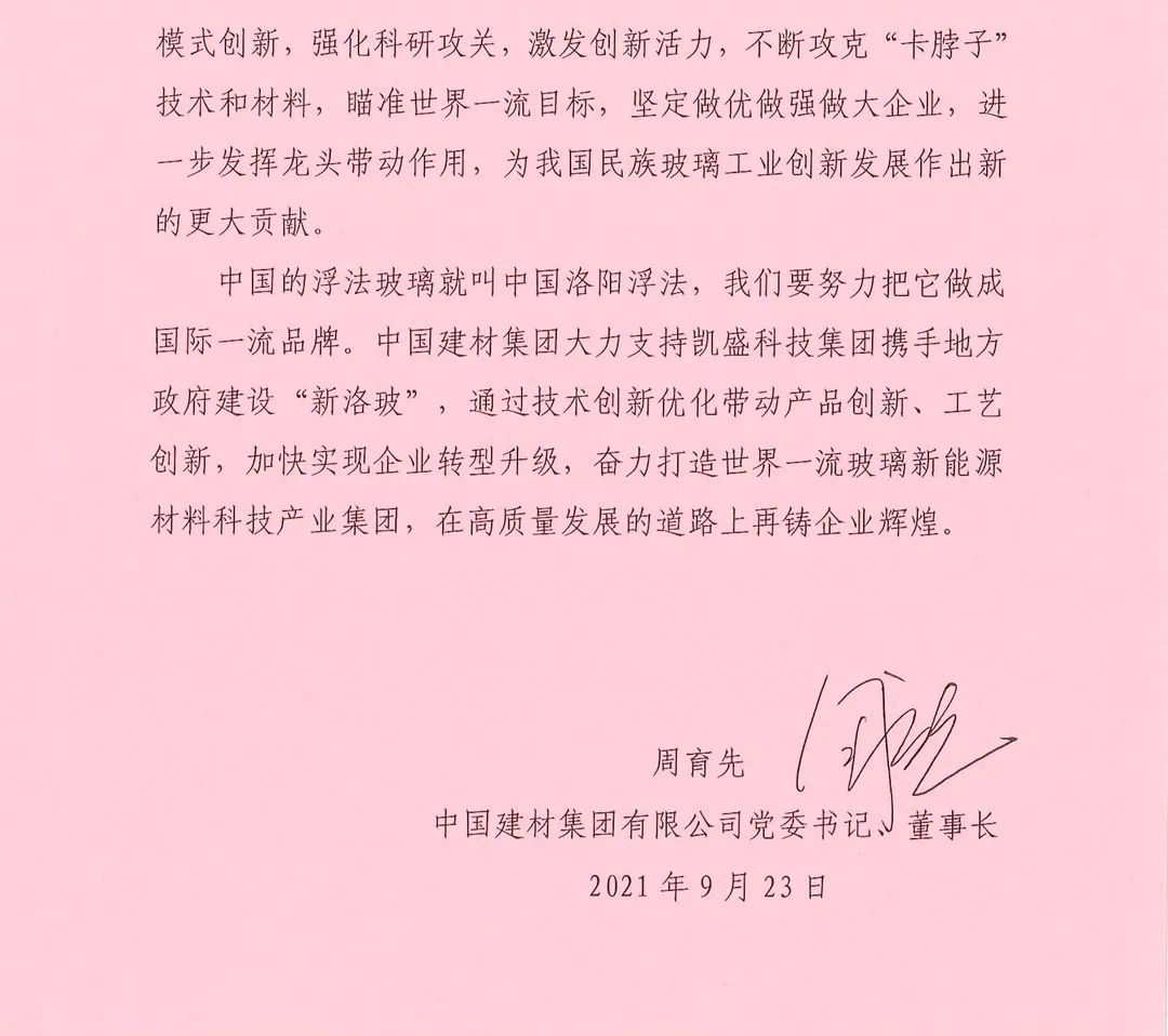 向中国洛阳浮法玻璃集团有限责任公司致贺信