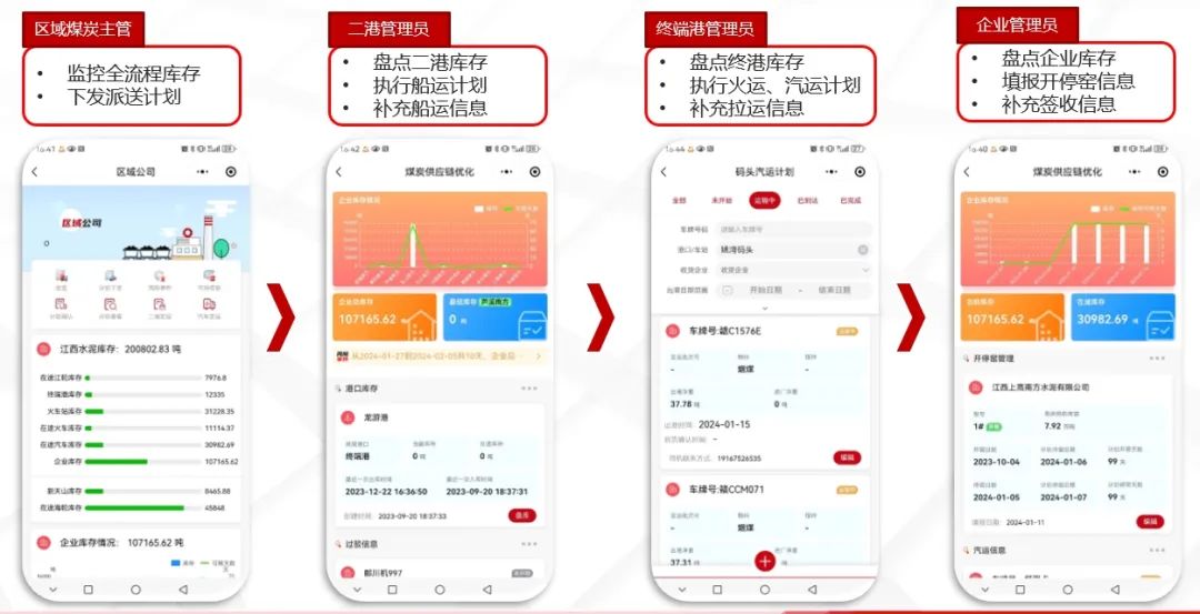 根据供应链日常工作场景特点,开发微信小程序以适应煤炭各环节人员使用习惯和现场工况,提升系统时效性及数据精度,移动端功能覆盖区域煤炭主管、二港管理员、终端港管理员、企业管理员、江船承运商、汽运承运商等全部业务角色,确保煤炭运输的各个环节,计划接收及时、过程图文上报、数据精准记录、信息随时追溯。