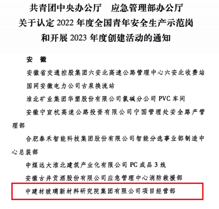 近日,在共青团中央、应急管理部联合组织开展的全国青年安全生产示范岗创建活动中,中建材玻璃新材料研究院集团有限公司项目经营部被认定为2022年度“全国青年安全生产示范岗”;在共青团中央组织开展的全国“两红两优”评选活动中,凯盛光伏材料有限公司团支部获评2022年度“全国五四红旗团支部”。下面,请跟随小料一睹他们的青春风采!
