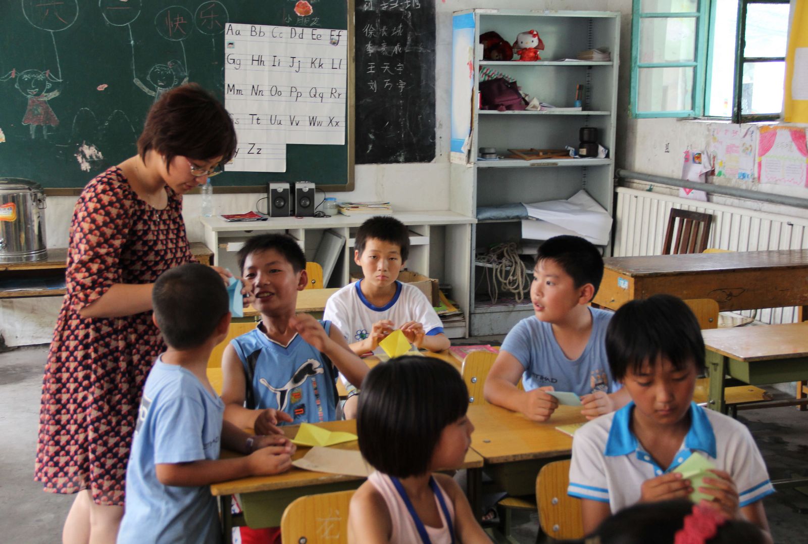在手工课上,志愿者耐心地教孩子们怎样折千纸鹤及爱心,引导他们将自己的爱心和梦想折进作品中。经过志愿者反复示范、讲解,孩子们很快学会了折叠的方法,看着自己亲手完成的作品,脸上露出了开心的微笑;音乐课中,志愿者选择了2008年北京奥运主题歌《北京欢迎你》,优美的旋律,加上“画意诗情带笑意”、“有勇气就会有奇迹”的歌词,更充分调动起孩子们的情绪,大家齐声歌唱,气氛热烈,场景感人。课间,志愿者与孩子一起打篮球,虽然烈日当头,每个人汗流浃背,大家玩得都很开心。