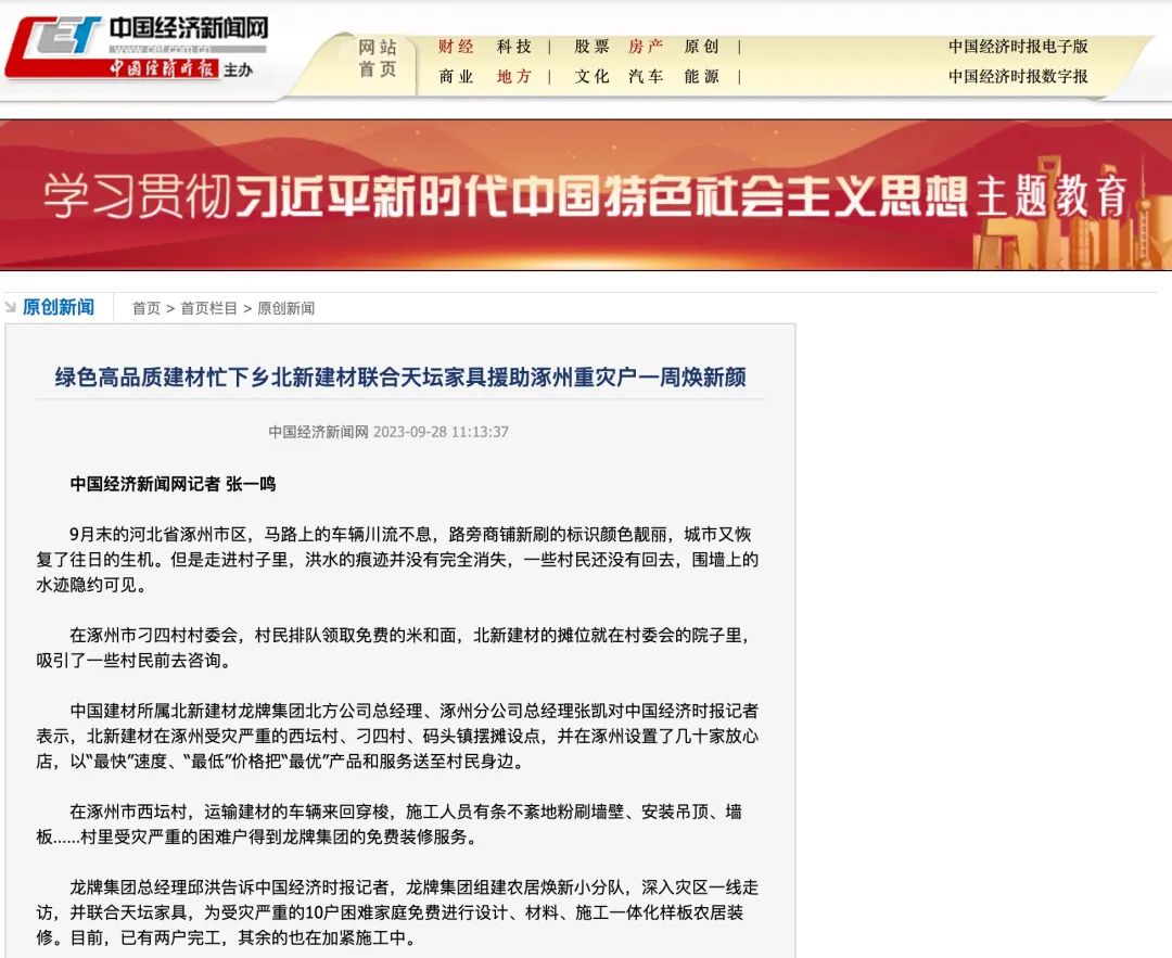 人民政协网从“创新服务模式 援助涿州重灾户一周焕新颜”角度介绍了北新建材践行央企责任,深入县乡灾区一线,积极助力灾区重建,把优质建材和服务送到村民身边,推动“四个转变服务升级”的创新实践。