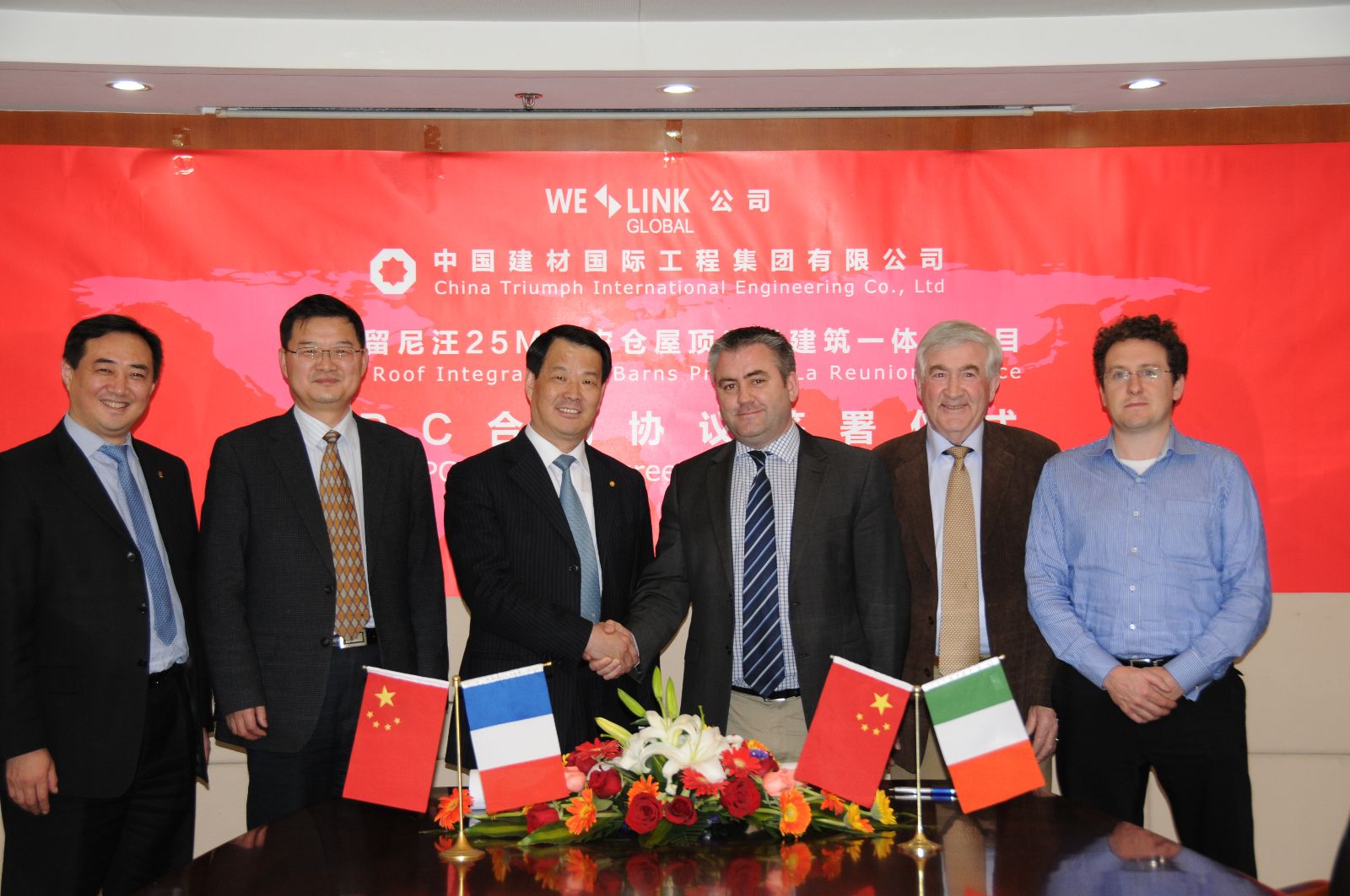 3月27日,中国建材国际工程集团有限公司和WElink Global Limited公司签署了在法国留尼汪岛建设25MW屋顶光伏建筑一体化项目的EPC总承包合同。中国建材工程集团董事长、总裁彭寿代表公司在合同上签字。中国建材工程集团常务副总裁孙建安,总裁助理、新能源工程部部长王丛笑等参加签字仪式。