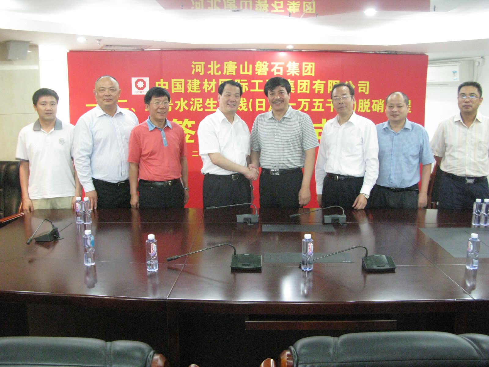 5月25日,中国建材工程所属江苏中建材环保研究院与河北磐石水泥有限公司签署了在河北唐山建设1#、2#、3#水泥生产线(共日产15000吨)SNCR脱硝项目,中国建材工程董事长、总裁彭寿与河北磐石水泥有限公司董事长李文秀代表双方在合同上签字。