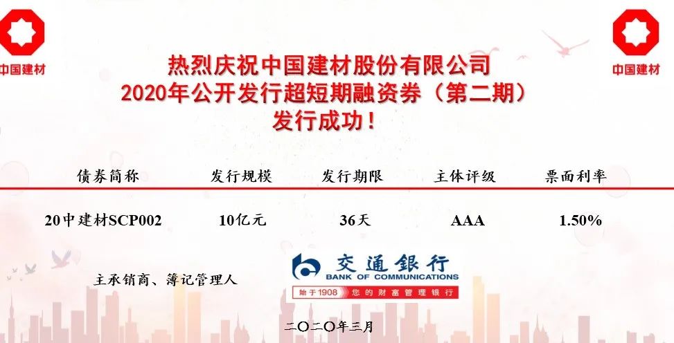2020年,中国银行间市场交易商协会发布新型高效的融资工具TDFI,beat365体育官方网站和中国建材股份有限公司都有这个资质,中国建材股份有限公司与国家铁路集团等21家企业成为首批第一类成熟层企业(TDFI企业)。TDFI有着非常严苛的入选条件,入选后适用更为便利的注册发行和信息披露机制,这也意味着中国建材得到了债券市场的广泛认可,知名度进一步提升,未来债务融资工具发行效率将进一步提高,融资成本将进一步降低,负债结构将进一步优化,为集团高质量发展提供有力保障。