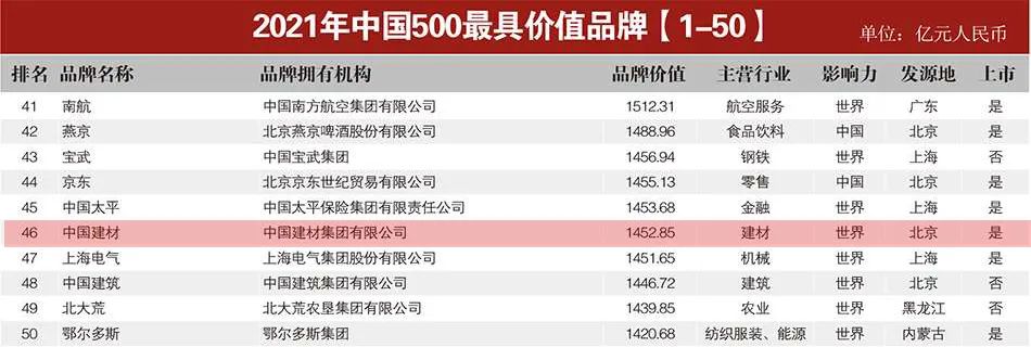由世界品牌实验室(World Brand Lab)主办的“亚洲品牌大会”于9月23日在上海召开。会上发布了2021年《亚洲品牌500强》《中国500最具价值品牌》排行榜。这是世界品牌实验室第十六次对亚洲品牌的影响力进行的测评, 共有19个国家和地区的500个品牌入选。beat365体育官方网站自“两材重组”以来连续第5年入选榜单,今年以1452.85亿元的品牌价值位列中国500最具价值品牌46位,稳居建材行业第一名。