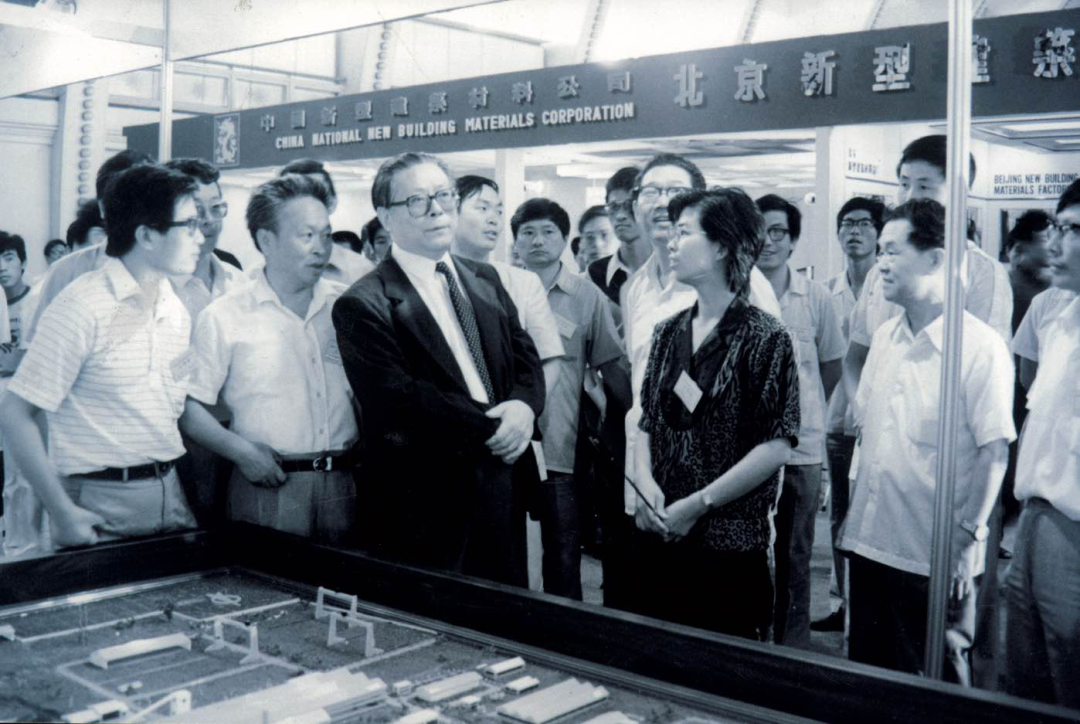 1987年9月,在上海举办的全国第二届新型建筑材料展销会上,江泽民同志参观原中国新型建筑材料公司和北京新型建材厂展位,听取新型建材发展情况的汇报。
