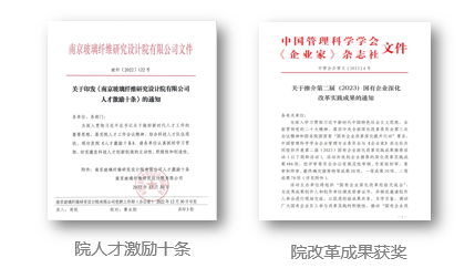 秉持“院士、专家、工程师、工匠” 四层级人才培养思路 召开人才工作会议 发布“人才激励十条” 强化科技人才队伍建设 持续健全中长期激励体系 改革成果荣获 国有企业深化改革实践优秀案例一等奖 全国企业文化优秀成果 全国企业文化建设最佳实践企业 全国企业管理现代化创新成果二等奖 行业、省级企业管理现代化创新成果一等奖等荣誉 南京玻纤院人才工作会议 01. 重视科技人才职业通道建设 南京玻纤院“专家”选聘评审会 南京玻纤院“两总”及后备人才培训班 02. 推动产业工人队伍建设改革 打造“双师型”人才队伍 成立江苏玻纤产业工匠学院 劳模(工匠)创新工作室联盟 主办全省玻纤及制品检验工 职业技能竞赛 培养院技能人才529名 “双师型”人才26名 获全国技术能手2人 全国建材工匠1人 全国纺织大工匠1人 江苏省五一劳动奖章4人 其他荣誉奖项近20人 阶段成果 在《工人日报》《新华日报》 《学习强国》媒体报道 南京玻纤院“培—鉴—竞—用”技能型人才管理体系 共建成立江苏玻纤产业工匠学院 “江苏工匠”岗位练兵及玻纤及制品检验工职业技能竞赛 03. 优化科技人才薪酬激励机制 重视科技人才激励体系建设 强化正向激励 激发内生活力 推动落实 重大项目薪酬总额单列激励 建立实施 科技类专项奖励 形成3大类、12项激励措施 为内容的多样化特色激励体系 南京玻纤院差异化薪酬管理体系 南京玻纤院薪酬总额管控动态管理机制 南京玻纤院试点重大项目薪酬总额单列 释放创新活力 发展再创新高 “十四五”以来 南京玻纤院通过国企改革行动和创新发展举措 企业呈现新气象、迸发新活力 综合实力和经营效益 不断迈上新台阶 在国资委2022年度 科改企业考核中获评优秀 改革再启程 踔厉奋发向前 快马加鞭未下鞍 撸起袖子加油干 南京玻纤院将以习近平新时代 中国特色社会主义思想为指导 深入贯彻落实党的二十大精神 深入开展国企改革深化提升行动 以科改行动为契机 围绕“四个面向” 突出战略重点 以改革促发展,以创新求实效 切实强化核心竞争力和核心功能建设 不断塑造发展新动能新优势 推动高质量发展!