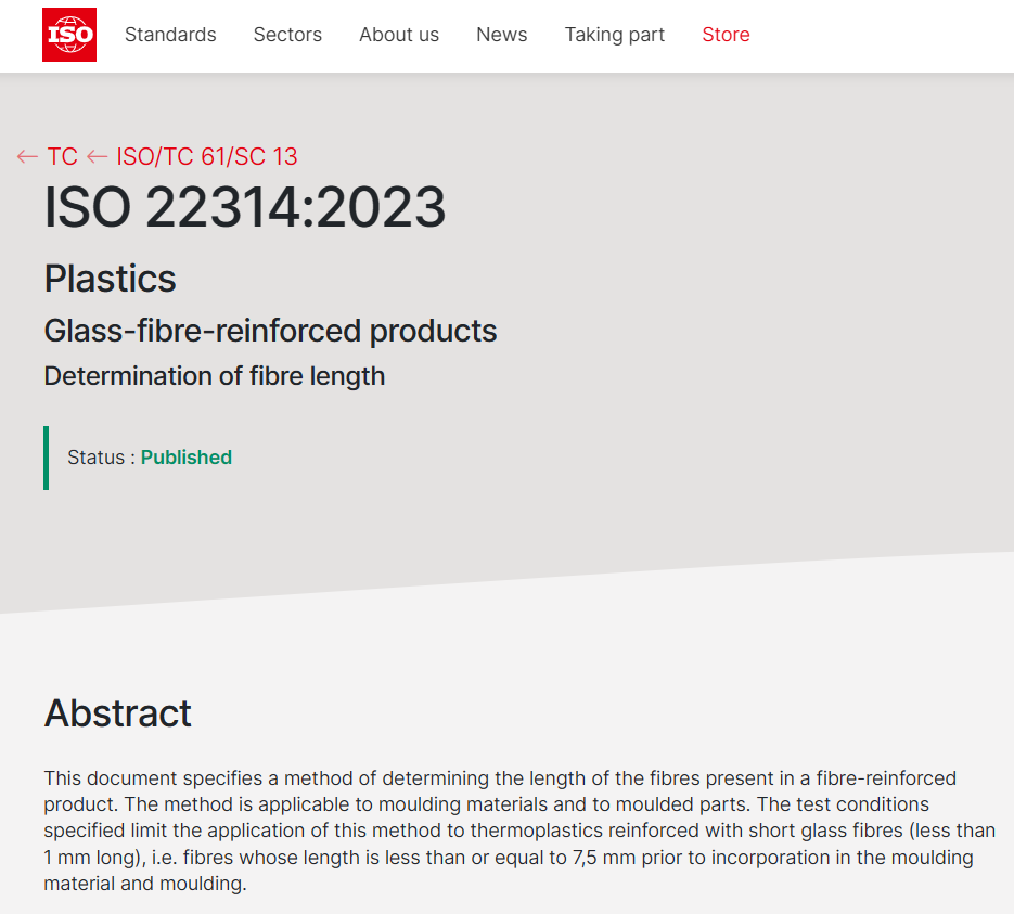 近日,北玻院首个主导修订的国际标准ISO22314:2023《塑料 玻璃纤维增强制品 纤维长度的测定》(Plastics—Glass-fibre-reinforced products—Determination of fibre length)正式发布。该标准规定了一种测定玻璃纤维增强热塑性复合材料制品中纤维长度的方法。此次修订历时15个月,各阶段标准草案投票均获得10余个ISO投票权成员国100%的赞成票。该项标准的成功发布,标志着公司迈上国际标准制修订工作的新台阶,提升了中国在国际标准化领域的话语权。