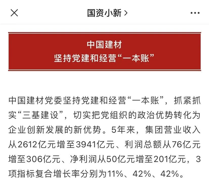 中国建材党委坚持党建和经营“一本账”,抓紧抓实“三基建设”,切实把党组织的政治优势转化为企业创新发展的新优势。5年来,集团营业收入从2612亿元增至3941亿元、利润总额从76亿元增至306亿元、净利润从50亿元增至201亿元,3项指标复合增长率分别为11%、42%、42%。