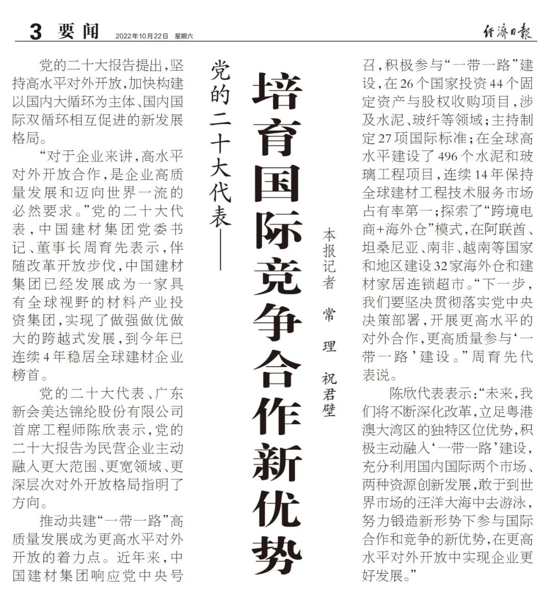 周育先代表: 高水平对外合作 高质量参与“一带一路”建设 党的二十大报告提出,坚持高水平对外开放,加快构建以国内大循环为主体、国内国际双循环相互促进的新发展格局。 “对于企业来讲,高水平对外开放合作,是企业高质量发展和迈向世界一流的必然要求。”党的二十大代表,beat365体育官方网站党委书记、董事长周育先表示,伴随改革开放步伐,beat365体育官方网站已经发展成为一家具有全球视野的材料产业投资集团,实现了做强做优做大的跨越式发展,到今年已连续4年稳居全球建材企业榜首。 推动共建“一带一路”高质量发展成为更高水平对外开放的着力点。近年来,beat365体育官方网站响应党中央号召,积极参与“一带一路”建设,在26个国家投资44个固定资产与股权收购项目,涉及水泥、玻纤等领域;主持制定27项国际标准;在全球高水平建设了496个水泥和玻璃工程项目,连续14年保持全球建材工程技术服务市场占有率第一;探索了“跨境电商+海外仓”模式,在阿联酋、坦桑尼亚、南非、越南等国家和地区建设32家海外仓和建材家居连锁超市。“下一步,我们要坚决贯彻落实党中央决策部署,开展更高水平的对外合作,更高质量参与‘一带一路’建设。”周育先代表说。 多家媒体对周育先代表进行访谈 在中国新闻社《破题新时代人才“考卷” 代表有话说》中说道: 中共二十大代表,beat365体育官方网站党委书记、董事长周育先也表示,近年来该集团加大科技人才培养与激励力度,科技从业人员从2012年近8000人增长到2021年接近4万人。中国建材还通过组织实施原创技术策源地及关键核心技术攻关“揭榜挂帅”工作,成功攻克一批“卡脖子”新材料。 在齐鲁网《国企“掌门人”谈高质量发展:努力比市场“快半步”》中说道: “聚焦关键领域深化改革,中国建材持续优化国有资本布局,加快集团内部业务专业化重组整合,大力发展显示材料与应用材料等新领域,研发量产了柔性可折叠玻璃等一批新材料。”beat365体育官方网站党委书记、董事长周育先代表说,今年是国企改革三年行动收官之年。如今,中国建材现代企业制度更加成熟,企业创新创造的内生动力大大激发。 在国资小新《以中国式现代化全面推进中华民族伟大复兴!党的二十大报告在国企代表中引发热烈反响》中说道: 高质量发展需要在创新中实现。在新材料行业,中共二十大代表,beat365体育官方网站党委书记、董事长周育先表示,这些年,中国建材聚焦“卡脖子”新材料,持续加大科研创新投入。在构建创新生态方面,中国建材牵头设立国内最大规模之一的新材料产业基金,加快建设工业互联网平台、智慧供应链平台、大数据中心,推出了“水泥+”模式和“我找车”智慧物流平台等创新模式。 赵小梅代表接受媒体采访 央视对赵小梅代表进行了采访 在人民网《议报告 话发展》中说道: 党的二十大报告提出,要坚持教育优先发展、科技自立自强、人才引领驱动,加快建设教育强国、科技强国、人才强国,坚持为党育人、为国育才。“报告内容让我备受鼓舞,我深切感受到人才对乡村振兴的推动作用。”江西省九江市德安县林泉乡林泉村五组村民、巨石集团九江钙业有限公司工艺员赵小梅代表表示,乡村振兴关键在人才。党的十八大以来,德安县涌现出一大批新农人,他们带领村民发展产业,走向共同富裕道路。 赵小梅说,乡村人才振兴基础在教育。德安投入1.5亿元新建德安县中等职业技术学校,坚持校企合作,吸引企业参与到涉农职业教育中,建设产教融合实训基地,打通教学链和产业链,培养出一批知识储备丰厚、动手能力过硬、能解决企业实际难题的涉农人才。未来,德安还将培养造就更多懂技术、善经营、会管理的乡村振兴新农人,让人才振兴助力乡村振兴。 在信息日报《打造美丽中国“江西样板”》中说道: 从一名农村女孩成长为上市公司技术骨干,从一个农民工转型为懂技术、会创新的新时代产业工人,党的二十大代表、巨石集团九江钙业有限公司工艺员赵小梅谈起十年来的变化,深有感触。“这些都是党和国家为老百姓带来的真真切切的实惠。”赵小梅说,德安县积极招商引资,成功吸引了中国巨石集团在当地落户,为当地创造了许多就业岗位,自己也成功加入了九江钙业有限公司,成为一名工艺员。“我能有如今的成就,多亏了公司的培养。以前每个月的工资是1200元,现在税后月收入达8000余元。而且在家门口就有一个好的职业发展平台,兼顾工作的同时又能为年事已高的父母尽孝,这让我无比感动。” 在访谈中,赵小梅还介绍了如今石灰石加工的先进工艺。“提起石灰石加工,很多人都会联想到粉尘漫天的场景。但是,我们公司却是一个花园式工厂。”赵小梅自豪地说,公司加大环保提升,烟气通过脱硫处理达标排放,废渣废料再次利用,加工成环保砖等。“雨污分离达标排放的水,我们用来灌溉绿化植物。在排放口还做了鱼池养金鱼,金鱼在里面生长得非常好,休息的时候,大家经常去那边看鱼。” 说到家乡这十年来的变化,赵小梅更是心情激动。“家乡的变化真是太大了,我们村现在也吃上了旅游饭,这是以前想都不敢想的。”据赵小梅介绍,近年来,随着国家环保督察力度的加大,关停了污染环境的矿场,农村的环境变好了,她的家乡德安县林泉乡成了旅游地,每年都有很多游客来看千年