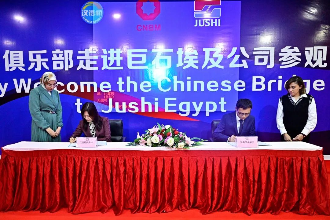双方共同签署了《中文+职业技能校企联盟合作协议》。巨石埃及公司副总经理马新耀、沈小冬,汉语桥俱乐部开罗站主席徐彦禾,苏伊士运河大学孔子学院中方院长张廷洪,苏伊士大学中文系主任Yahya等领导以及苏伊士运河大学孔子学院、苏伊士大学、英国大学近50名师生共同见证了这一时刻。