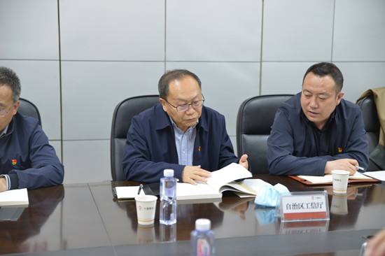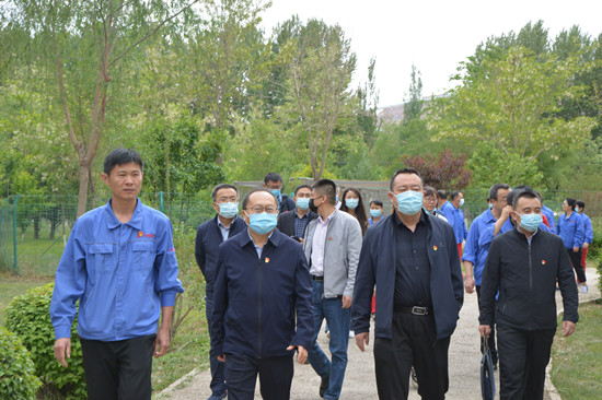 宁夏回族自治区工业和信息化厅二级巡视员李怀马、原材料处处长金立军、节能与综合利用处处长张建平,政策法规处副处长张红英等一行参观宁夏赛马公园、职工菜地、支部阵地、智能仓储、智能装车。全体人员参加主题党日学习会,学习会由金立军主持。李怀马带领全体党员学习习近平总书记在黄河流域生态保护和高质量发展座谈会上的讲话精神。