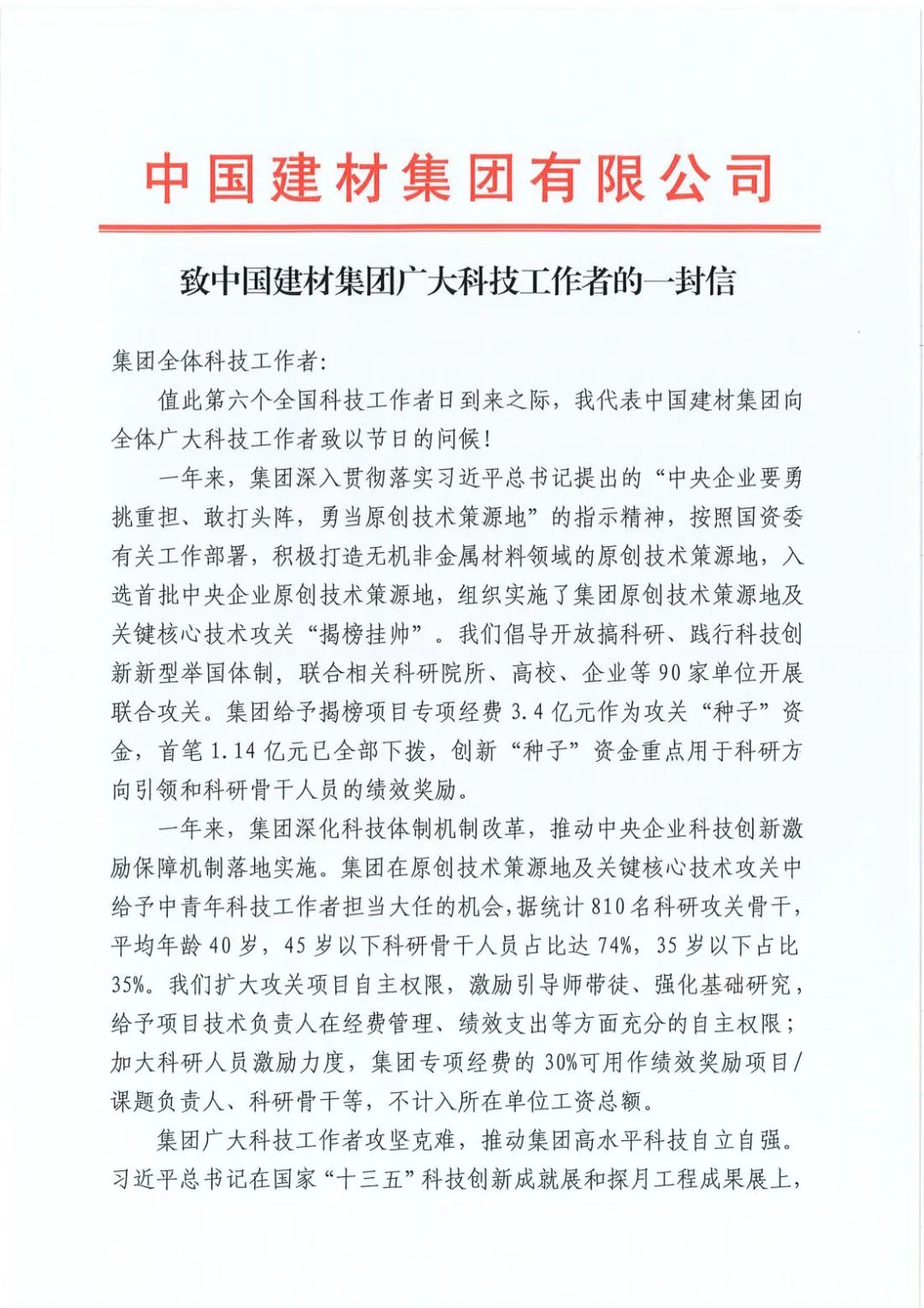 集团广大科技工作者攻坚克难,推动集团高水平科技自立自强。习近平总书记在国家“十三五”科技创新成就展和探月工程成果展上,充分肯定了集团科技创新成果。集团全面超额完成国资委六项攻关任务,多次获得国资委表彰;制定我国碳纤维领域首个国际标准,两项成果分别荣获国家科技进步一等奖和技术发明二等奖。低热水泥助力白鹤滩打造“无缝大坝”,攻克高放核废液玻璃固化世界难题、助力实现我国高放废液处理能力零的突破,中性硼硅药用玻璃护航国产新冠疫苗生产,西宁万吨碳纤维基地入选“央企十大超级工程”,大批新材料新技术广泛用于空间站、神舟飞船、天问一号、武器装备等国家重大工程项目。牵头承担国家重大攻关专项,推动CR929宽体客机机身材料及结构等系列关键核心技术攻关;T800级碳纤维达到国际一流水平,获得中国商飞PCD预批准。牵头打造国家首个原材料行业“双碳”公共服务平台,开展低碳零碳负碳、CCUS、氢燃料替代、关键技术及标准攻关。