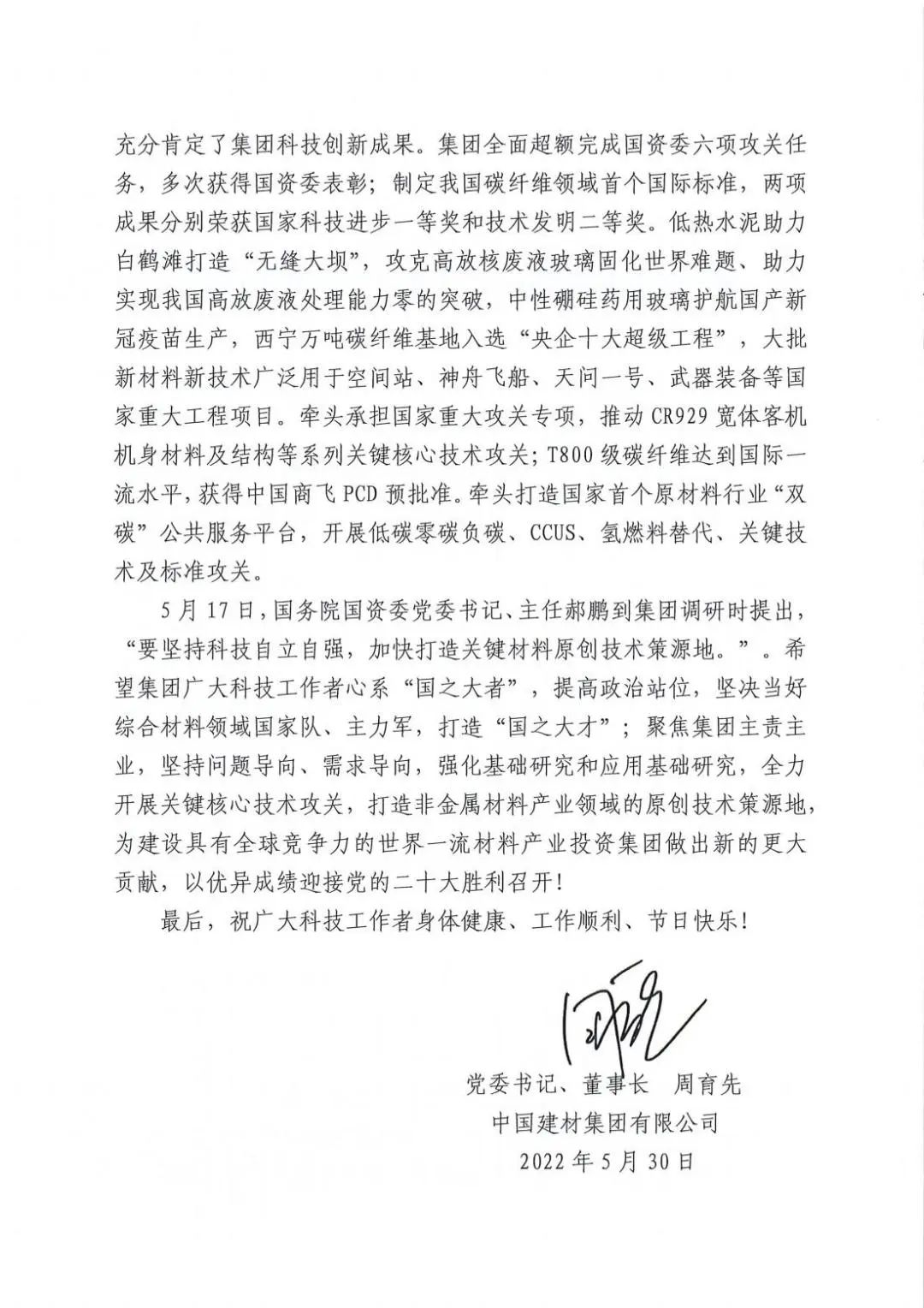 5月17日,国资委党委书记、主任郝鹏到集团调研时提出,“要坚持科技自立自强,加快打造关键材料原创技术策源地。”。希望集团广大科技工作者心系“国之大者”,提高政治站位,坚决当好综合材料领域国家队、主力军,打造“国之大才”;聚焦集团主责主业,坚持问题导向、需求导向,强化基础研究和应用基础研究,全力开展关键核心技术攻关,打造非金属材料产业领域的原创技术策源地,为建设具有全球竞争力的世界一流材料产业投资集团做出新的更大贡献,以优异成绩迎接党的二十大胜利召开!