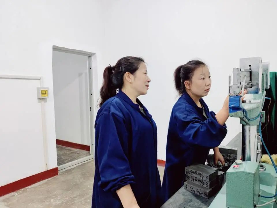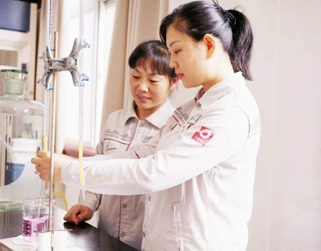 卧龙中联化验室高华茹(左)给徒弟尤晓茹(右)讲解滴定方法。