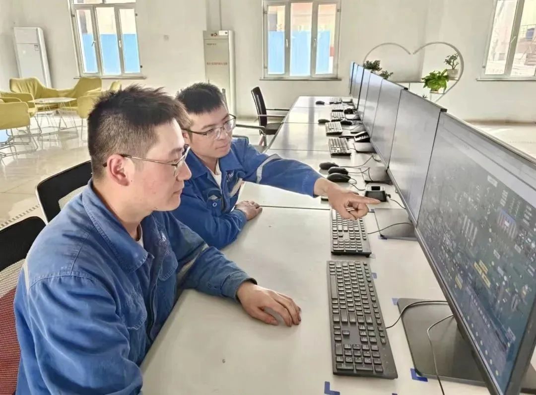 叶城天山刘泰明为徒弟赵鹏山讲解回转窑操作原理,传授操作经验,帮助年轻职工在岗位上成长成才。