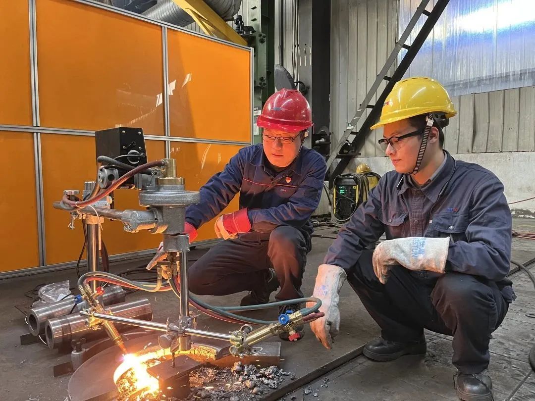 中国联合装备合肥神马结构分厂员工周伟(左)对徒弟夏林进行半自动火焰切割的一对一教学,通过师带徒的方式传承焊接工艺。