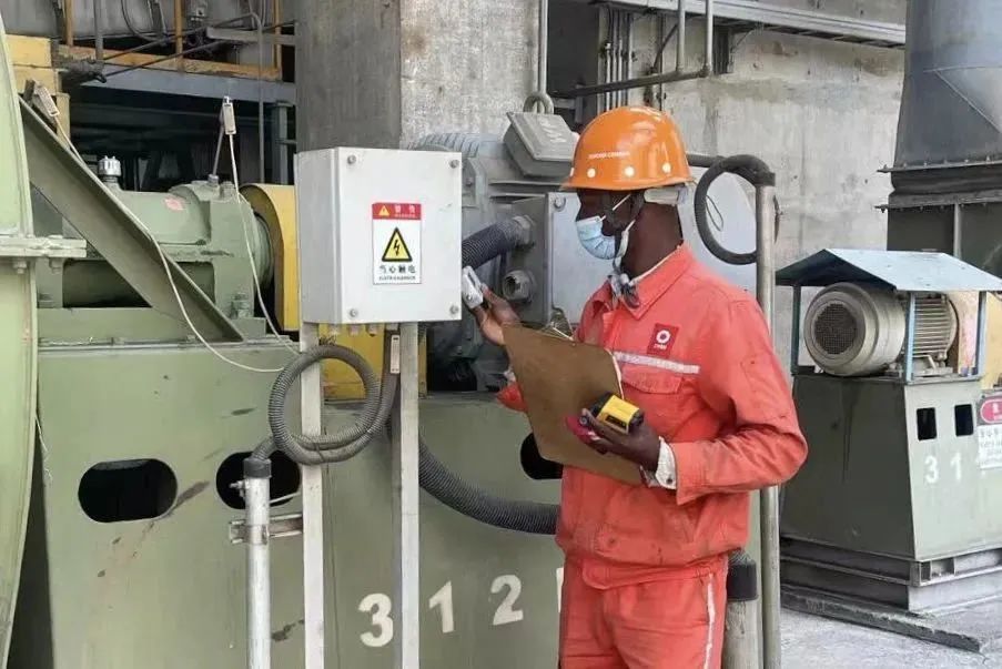 中国建材赞比亚工业园的本地员工在对窑头设备进行维护检查。