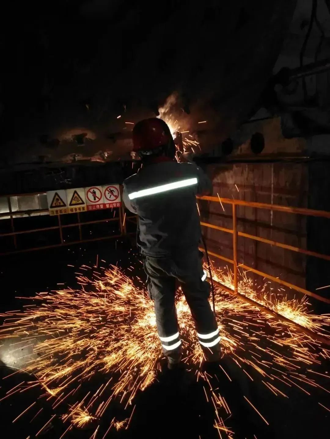 瓮安县玉山水泥生产部员工吴健华技能比武活动中发挥工匠精神,展示焊接技术,绽放铁花之美。