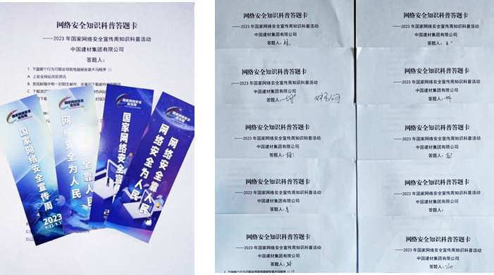 苏州中材建设开展了国家网络安全宣传周官方网站的知识竞猜活动,并组织公司全员(海外员工视频参加)开展了网络安全相关法规宣贯活动。