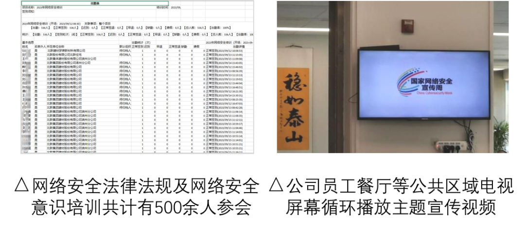 北新建材组织网络安全法律法规及网络安全意识培训,共计有500多人参加了培训,并在公司员工餐厅等公共区域电视屏幕循环播放主题宣传视频。