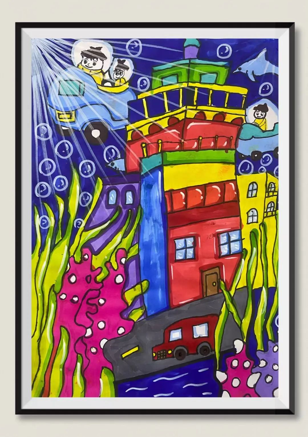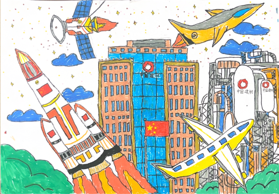 作品简介:这幅画融合了科技与建材的元素,轮船等彰显建材底蕴,火箭飞船展现科技力量;寓意创新发展,也寓意了建材走遍世界。