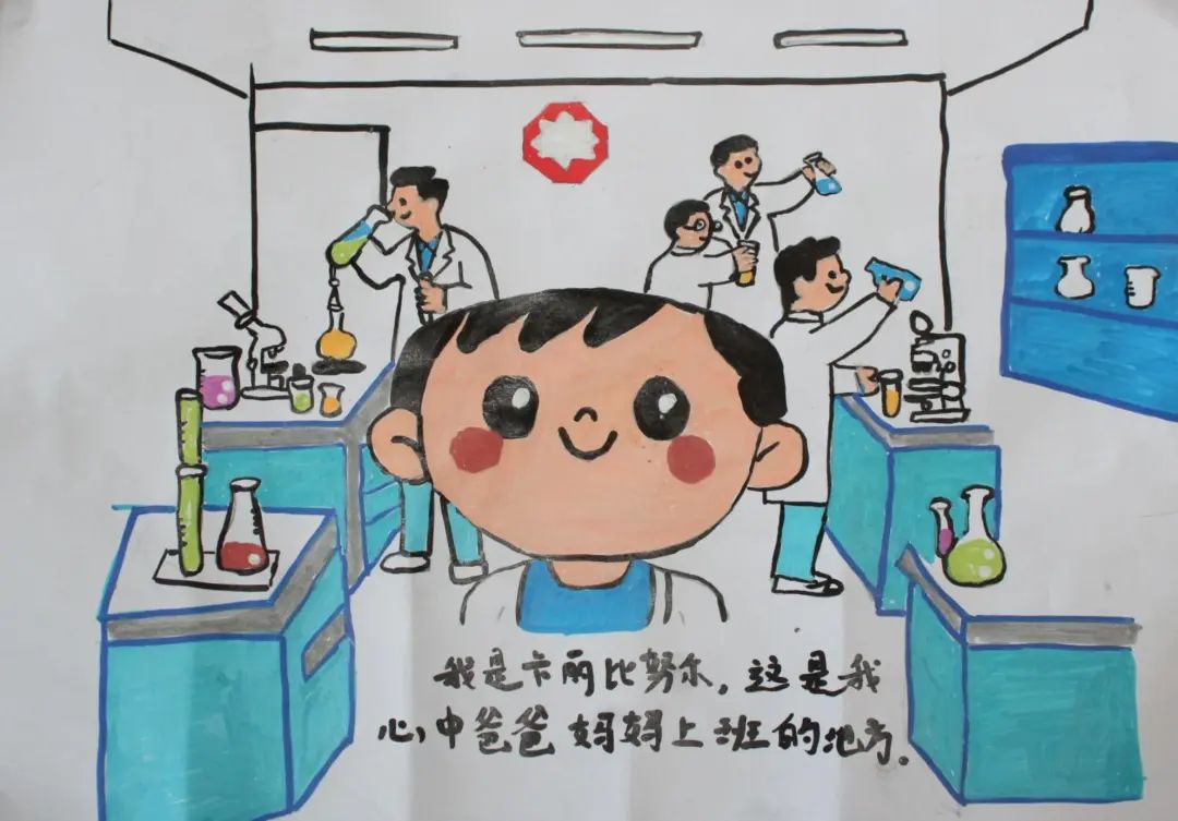 作品简介:妈妈在实验室变魔法戏法呢!灰水泥进玻璃瓶瓶,液体变蓝变粉像彩虹糖。她盯刻度的眼睛亮晶晶,比我数糖果还认真,原来她在给房子搭 “坚固小城堡” 呀!