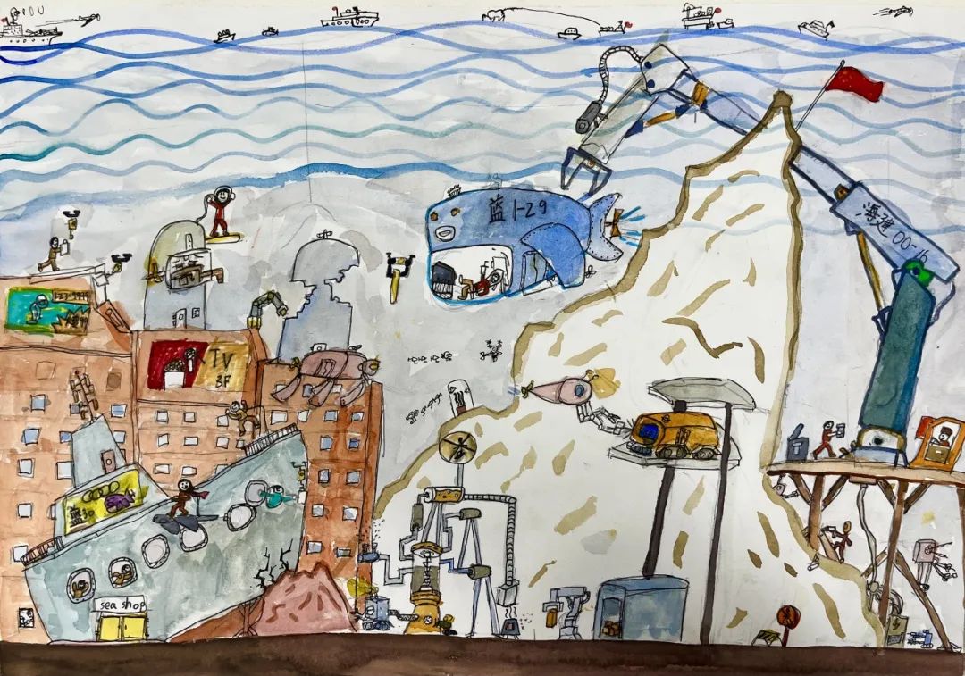 作品简介:整幅画通过丰富的想象,呈现出未来人类借助先进科技手段,利用海底材料进行大规模海底建设的壮阔画面。