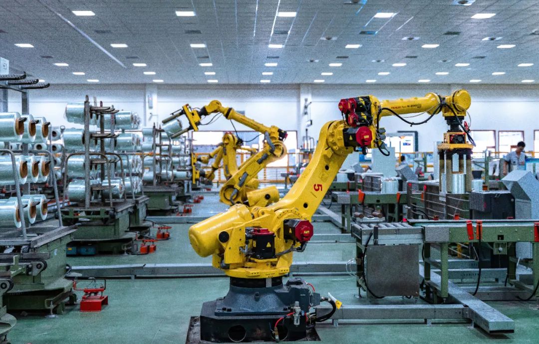“这些悬空的是智能机械臂,它负责把已完成包装的原丝筒送到指定的摆放位置。”