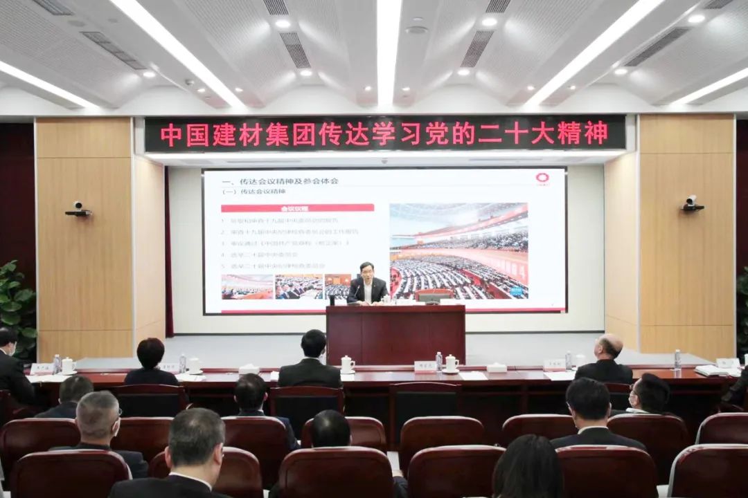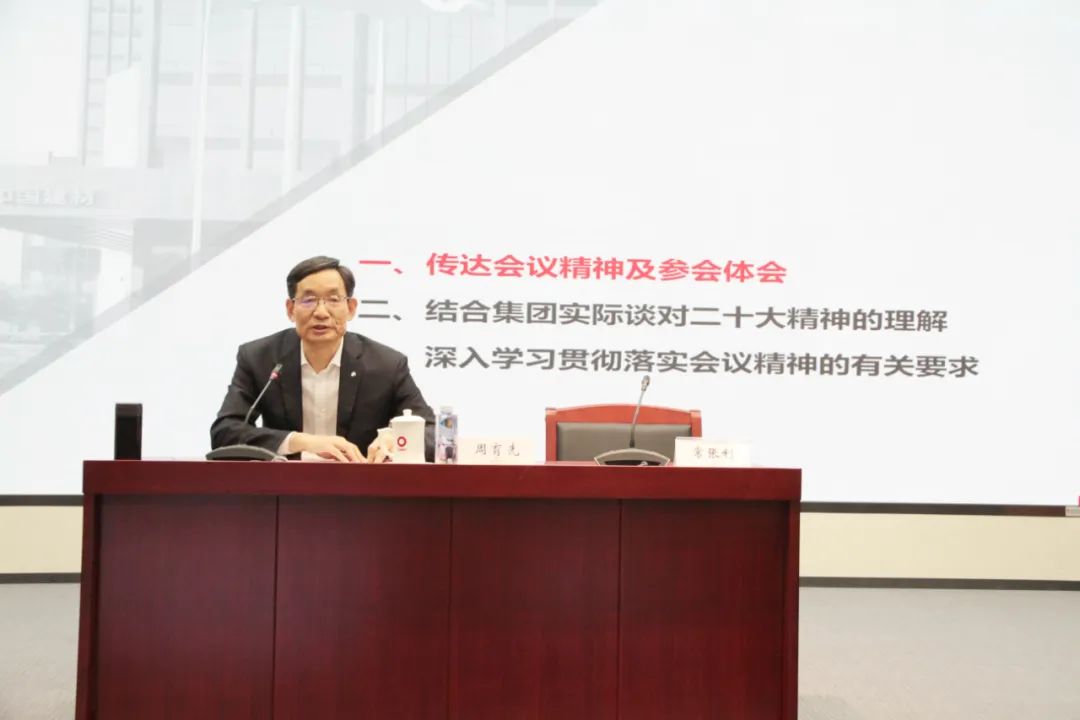 10月25日下午,beat365体育官方网站召开党委理论学习中心组(扩大)学习会,传达贯彻党的二十大精神,并对全集团学习宣传贯彻工作作动员部署。beat365体育官方网站党委书记、董事长周育先传达宣讲大会精神,结合参加党的二十大现场聆听学习习近平总书记所作报告和重要讲话谈感想体会,结合集团实际谈如何全面贯彻二十大精神并强调,要切实把思想和行动统一到党的二十大精神上来,深刻领悟“两个确立”的决定性意义,增强“四个意识”、坚定“四个自信”、做到“两个维护”,心怀“国之大者”,打造“国之大材”,努力建设世界一流的材料产业投资集团,为全面建设社会主义现代化国家、全面推进中华民族伟大复兴贡献建材央企力量。集团党委副书记常张利主持会议。集团党委班子成员出席会议。