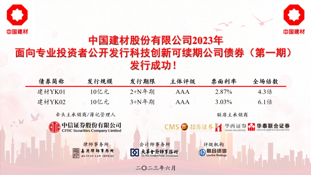 近日,中国建材股份精准把握债券市场发行窗口,成功发行首期科技创新类可续期公司债,发行总规模20亿元,期限分别为2+N年和3+N年,票面利率分别为2.87%和3.03%,全场认购倍数超4倍和6倍,票面利率创今年以来全市场同期限永续类债券票面利率新低。本次科技创新类可续期公司债的成功发行,是中国建材股份进一步运用债券市场服务国家创新驱动发展战略,以及畅通多元化融资渠道的有力举措。