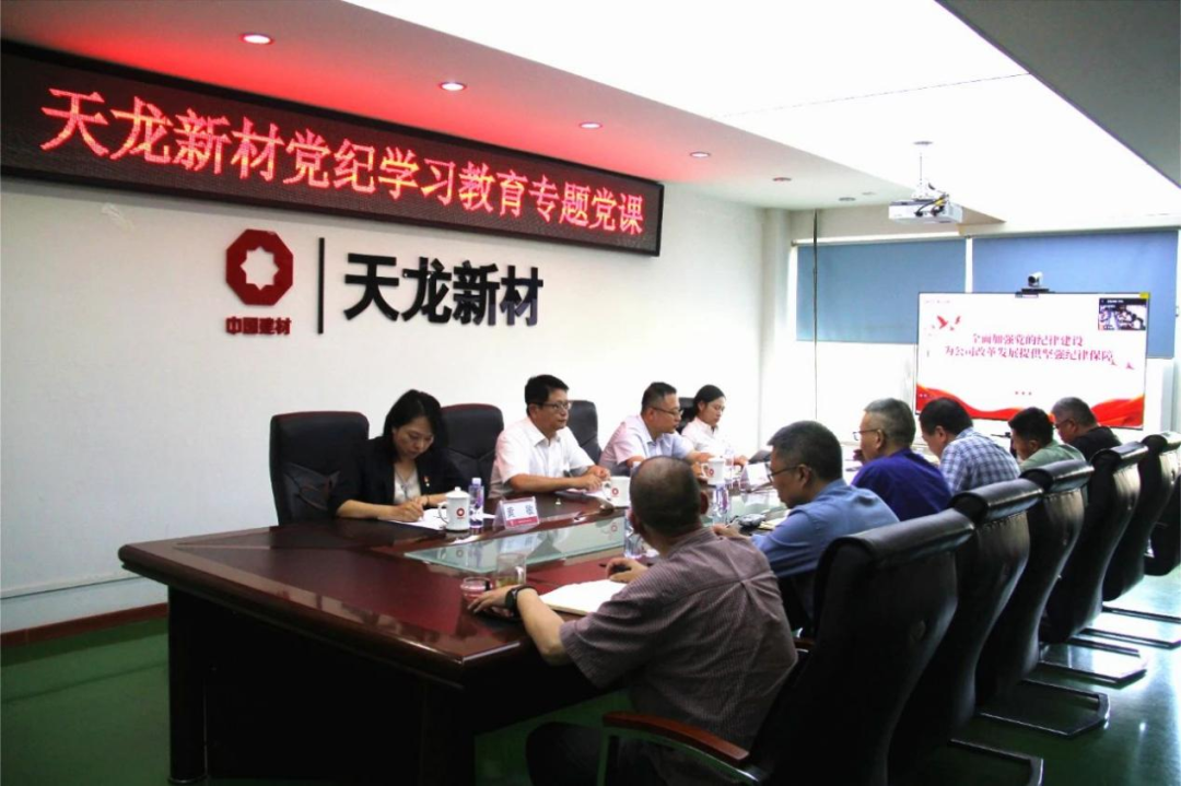 中建材资产管理公司党委书记、总经理冯玮以《全面加强党的纪律建设 为公司改革发展提供坚强纪律保障》为主题,为成员企业天龙新材全体党员干部讲专题党课。在党课中强调,天龙新材作为生产制造型企业,在人事任免、物资采购、招投标等重点领域关键环节应突出纪律意识,要以党纪学习教育为契机,全面准确掌握“六项纪律”的核心要求,不断增强遵守纪律规矩的行动自觉。领导干部要发挥“头雁效应”,在遵规守纪和担当作为上走在前、作表率,真正让纪律严起来、把规矩立起来,带动全公司上下形成建功新时代、争创新业绩的生动局面。天龙新材全体党员、资产公司党员代表、全体团员参加党课学习。
